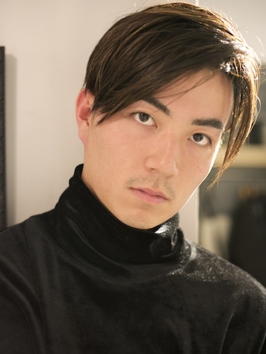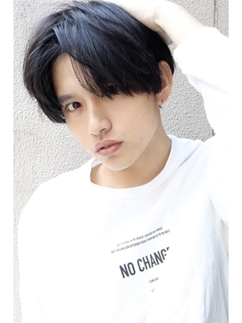 真っ直ぐに下ろした長めの前髪がシンプルながら個性的な髪型です。メガネやピアスなど、アクセサリーとの相性も抜群です。