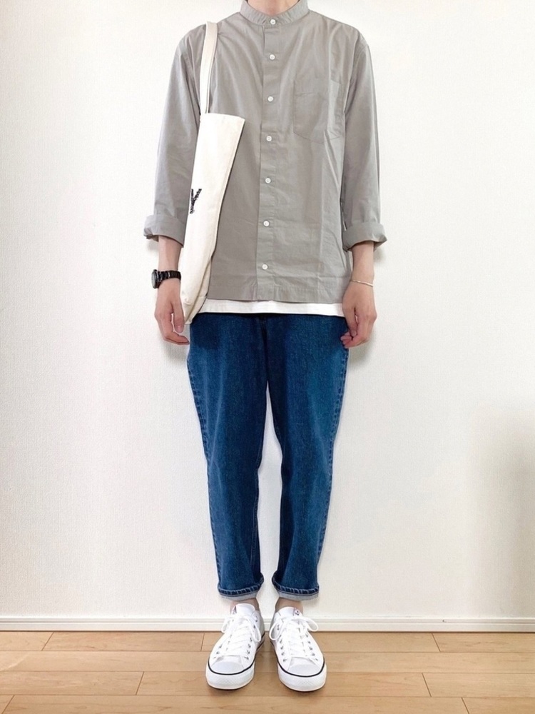 優しい色味が特徴的な無印良品のバンドカラーシャツを使った、自然派ナチュラルな着こなしのファッションです。バンドカラーシャツとデニムパンツやスニーカーは相性バッチリですね。