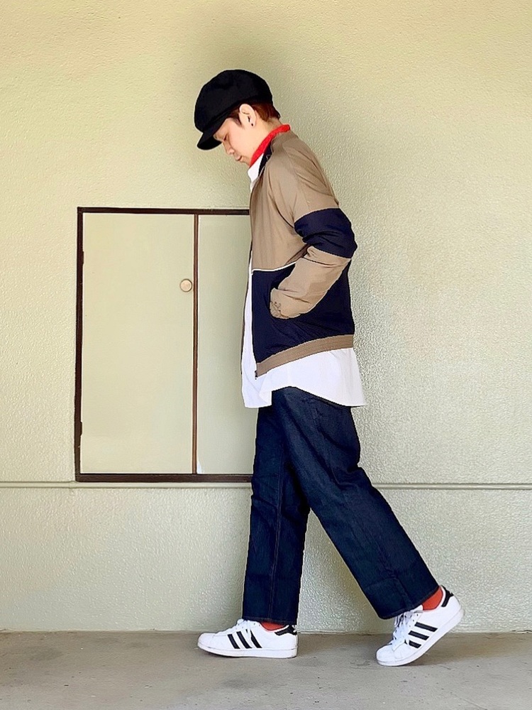タートルネック、バンドカラーシャツ、トラックジャケットを重ねたレイヤードコーデ。バンドカラーシャツとタートルネックの相性はバッチリです。襟元の差し色やトラックジャケットの色合が可愛らしい着こなしですね。キャスケットや白いスニーカーを使っており春っぽさ抜群なファッションです。