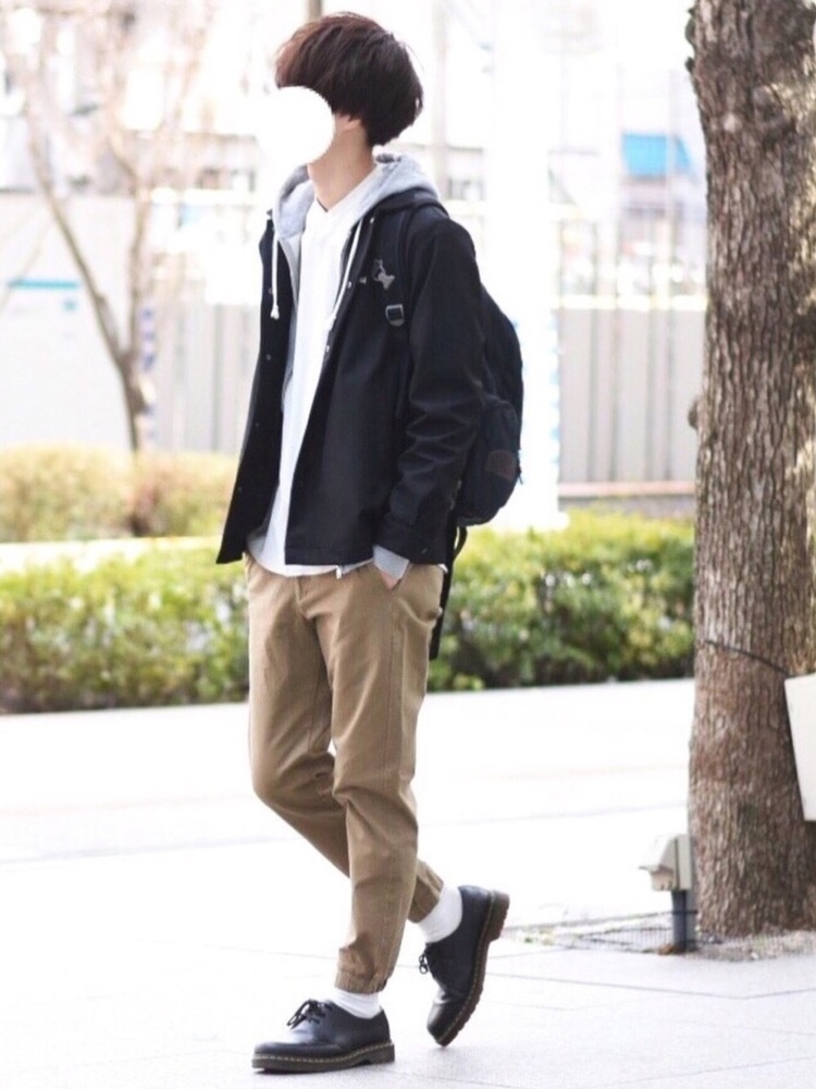 コーチジャケットやパーカー、ジョガーパンツを使った、全体的にカジュアルな着こなしのファッションです。インナーにバンドカラーシャツを使うことによって、襟元がすっきりしていて、ラフになりすぎない程よい抜け感を出すことができます。