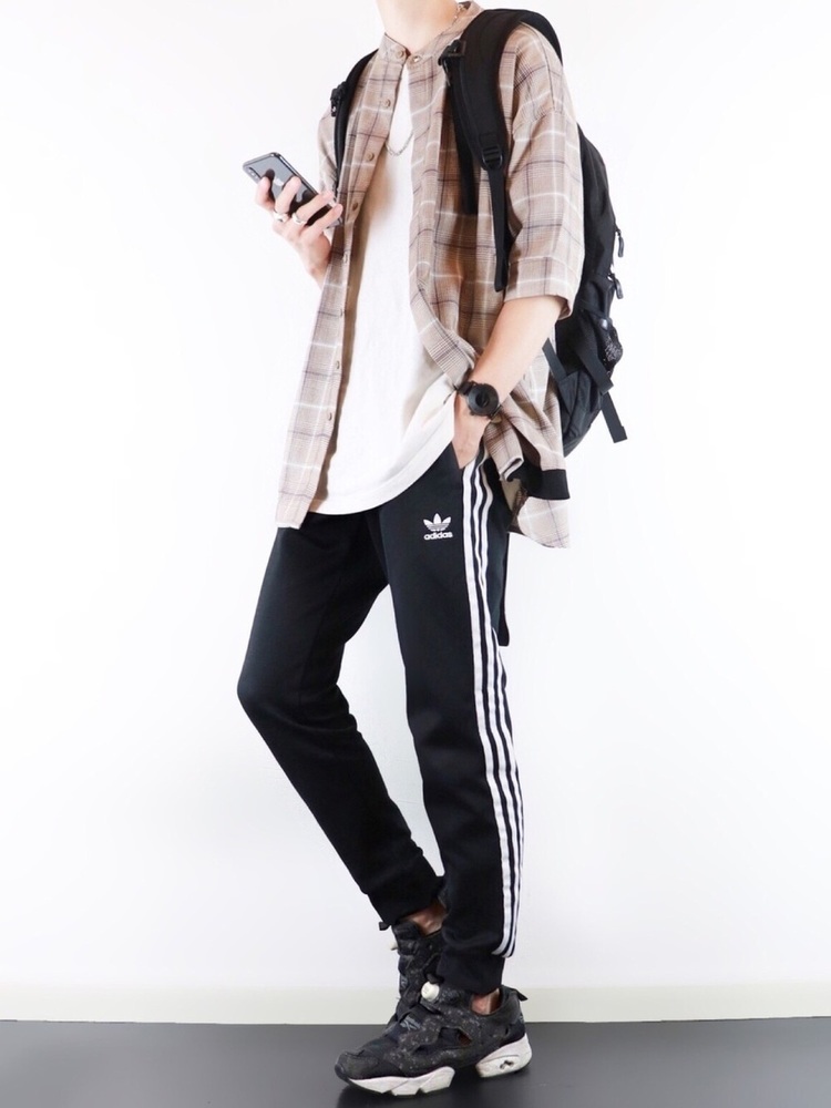 トラックパンツを着用することによってスポーティーな印象のファッションに仕上がっています。バンドカラーシャツは襟の詰まったデザインなので顔でかく見えてしまわないかと心配する人もいますが、このようにシャツなどの上から羽織ったり、襟の部分のボタンだけ外すとその心配はなくなりますよ。