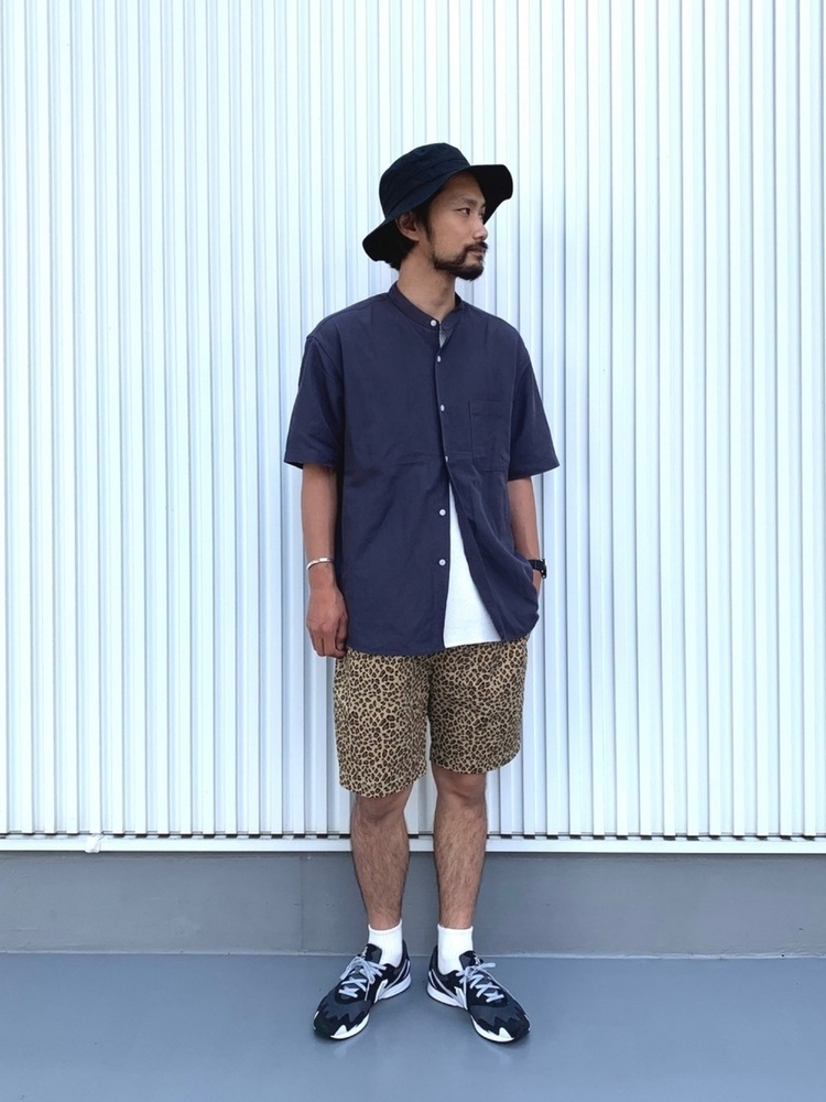 ヒョウ柄ハーフパンツもシンプルなバンドカラーシャツと合わせると派手になりすぎないカジュアルな着こなしになりますね。ベーシックなバンドカラーシャツにボトムスで遊びを入れたコーディネートです。