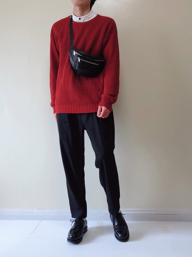 赤いニットが特徴的なこちらのコーディネート。ニットを着る時、重ねるシャツを襟のついたものではなくバンドカラーシャツにするだけで、首回りがゴチャゴチャせず、すっきりとした印象を持たせることが出来ますね。