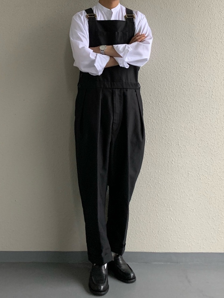 シンプルな白いバンドカラーシャツに黒いオールインワンを合わせることによって個性が出ていますね。胸元まであるオールインワンも襟のないバンドカラーシャツならさっぱりと着ることができます。