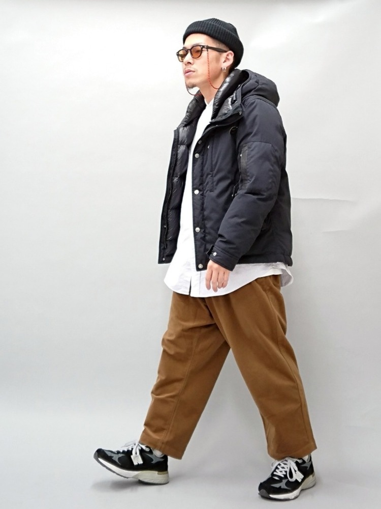 バンドカラーシャツとダウンで冬のゆったりカジュアルコーデ
