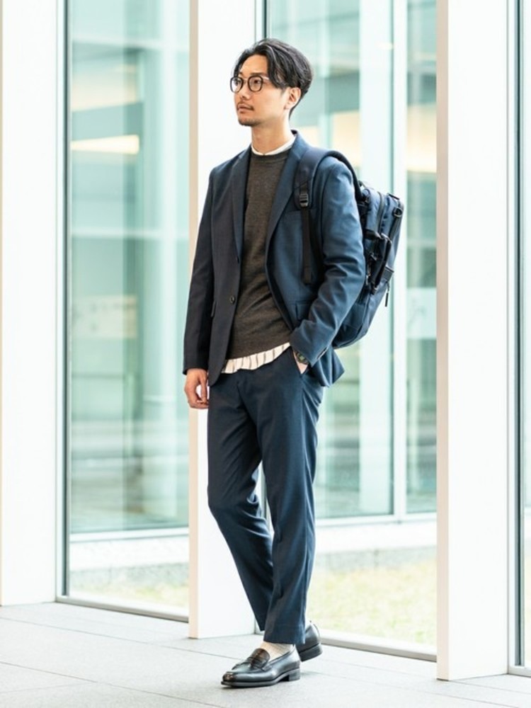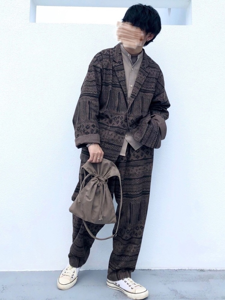 テーラードジャケットという点では同じですが、先程とは打って変わってダボっとしたタイプの柄物テーラードジャケットを使った着こなしになっています。襟元を開けたバンドカラーシャツのなかから、モックネックのカットソーがちらりと覗くのがお洒落ですね。