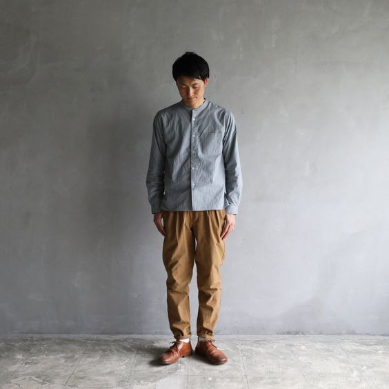 バンドカラーシャツをタックインでキレイめメンズコーデ